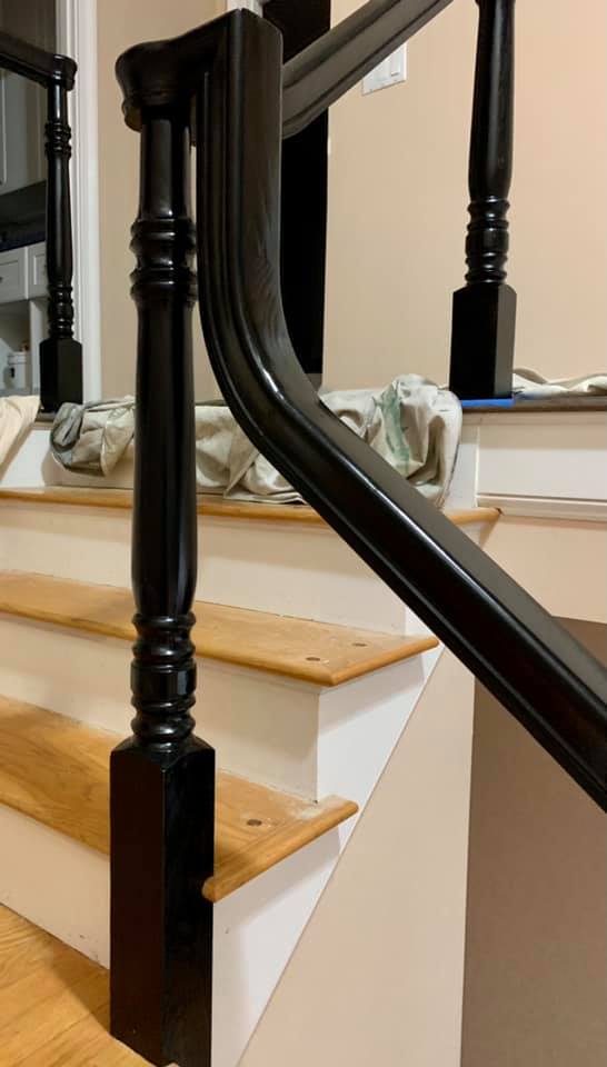 We also decided to save some money on the stairs (and when I say some, I mean thousands), and have them restained, handrails painted, and new bausters put in. Our installers did a great job matching the stair stain to the rest of our floors. We did an oil based black paint on the railings (I don't really me we - we had this all done professionally), and put in new wrought iron bausters. Look amazing. We are so pleased and it has completely transformed the house.